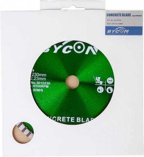 Алмазный диск Bycon Laser Turbo 230 мм (Байкон Лазер Турбо 230 мм) применяется, как правило, на угловых шлифовальных машинах (болгарках), а также на камнерезных станках и плиткорезах электрических. Обрабатываемые материалы: бетон, армированный высокопрочный железобетон, гранит, природный камень, бордюрный камень, твердый песчанник, твердая тротуарная плитка, клинкерный кирпич (клинкер) и другие материалы.