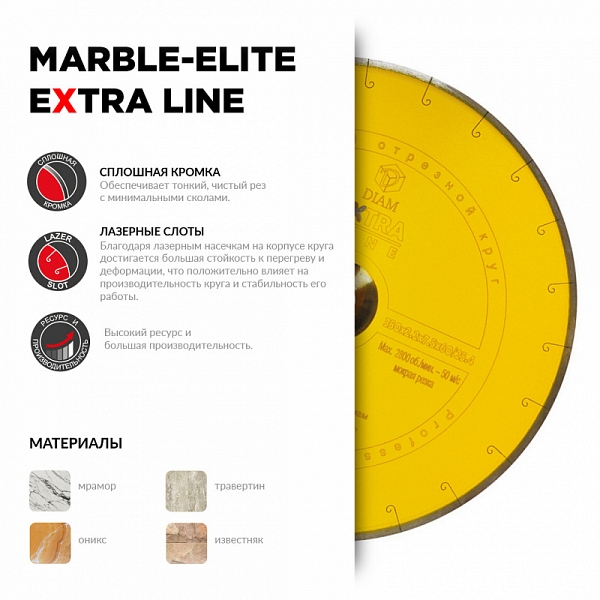 Алмазный отрезной круг Diam Extra Line 1A1R Корона Marble-Elite 350 мм (Диам Экстра Лайн 1А1Р Корона Марбл-Элит 350 мм) – профессиональный алмазный диск специального назначения для высокопроизводительной мокрой резки мрамора, оникса, травертина, известняка на бензорезах, электрических резчиках, настольных камнерезных станках, стенорезных машинах, швонарезчиках и промышленном оборудовании с подачей воды.