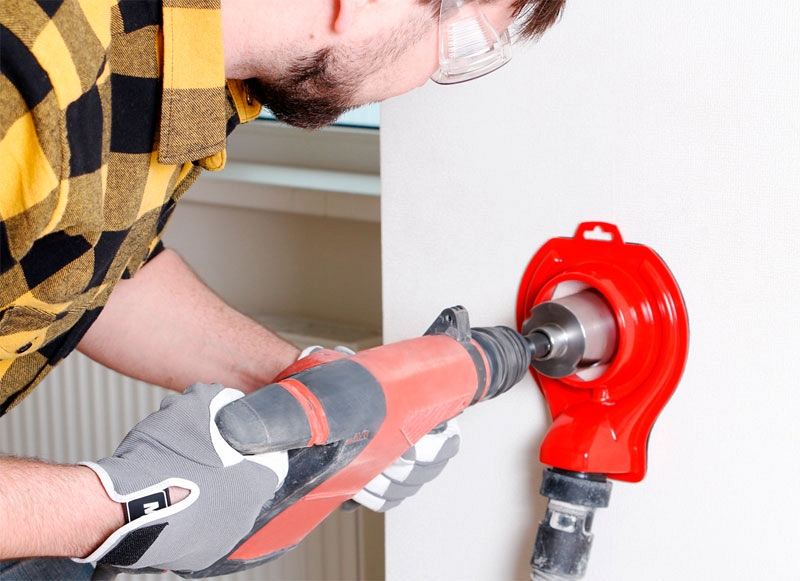 - Пылеотведение из зоны сверления подрозетниками, сверлами, бурами, коронками