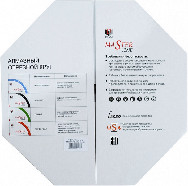 Сегментный алмазный круг Diam Master Line 1A1RSS Асфальт 350 мм (Диам Мастер Лайн 1А1РСС Асфальт 350 мм) – специальный алмазный отрезной диск с лазерной сваркой сегментов для сухой и мокрой резки асфальта, асфальтобетона, пенобетона, абразивного песчаника, кирпича и других абразивов на резчиках швов, стенорезных машинах, бензорезах, электрических резчиках, камнерезных станках, как с подачей воды, так и без нее.