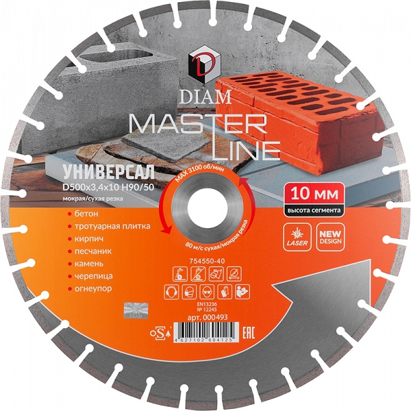 Сегментный алмазный круг Diam Master Line 1A1RSS Универсал 500 мм (Диам Мастер Лайн 1А1РСС Универсал 500 мм) – специальный алмазный отрезной диск с лазерной сваркой сегментов для сухой и мокрой резки бетона, тротуарной плитки, кирпича, черепицы, песчаника, природного и искусственного камня, строительных материалов общего назначения на камнерезных станках, стенорезных машинах, швонарезчиках, с подачей и без подачи воды.