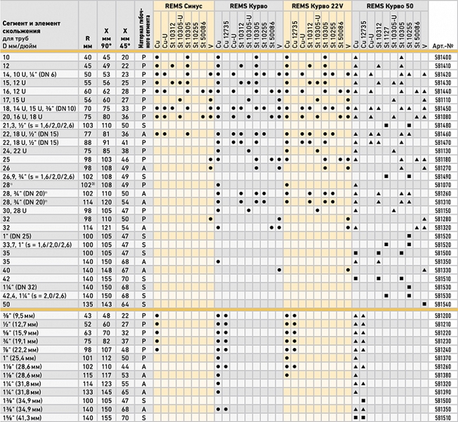 | Артикул | Диаметр труб | Материал труб | Размер R | Размер X 90° | Размер X 45° | Материал гибочного сегмента |