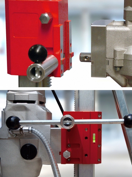 - В лицевой части опорной плиты имеется регулируемый упор для предотвращения биения алмазной сверлильной коронки при засверливании
